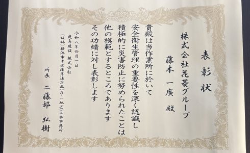 竹中工務店 ST-1000PJ甲府中央棟新築工事表彰状 株式会社花菱グ…